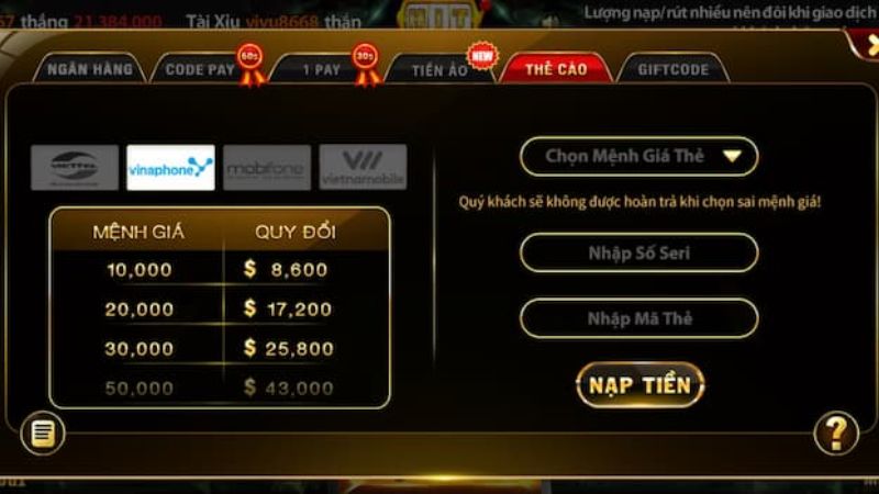 Nếu bạn muốn nạp tiền bằng thẻ cào, hãy chuẩn bị mệnh giá thẻ phù hợp và số lượng thẻ cần thiết. Đồng thời, bạn cần kiểm tra xem thẻ cào có còn hiệu lực, chưa sử dụng để tránh phát sinh lỗi khi nhập mã.