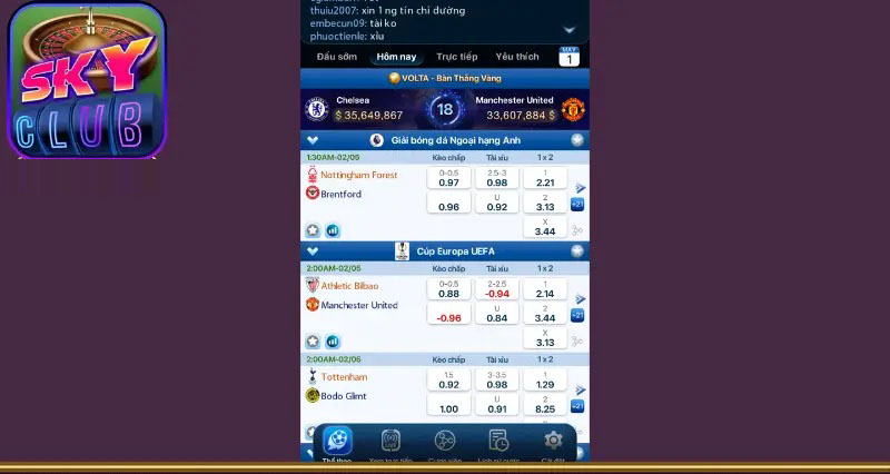 Dù không phải trang chuyên cá cược thể thao, Skyclub vẫn đầu tư xây dựng sảnh chơi đạt chuẩn quốc tế. Các bộ môn, danh sách trận đấu, bảng kèo, tính năng đặt cược và tỷ lệ odds đều được sắp xếp khoa học, logic. Chỉ cần vài cú click, người chơi mới cũng có thể nhanh chóng tìm thấy trận đấu yêu thích và hoàn tất lệnh cược mà không gặp bất kỳ trở ngại nào.
